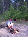 Večer jsme přijeli do kempu, který byl sice velice levný a na krásném místě, ale pouze s několika suchými záchody a pumpami s tekoucí studenou vodou. Rozhodli jsme se ubytovat pouze na jednu noc, vybalili stan, povečeřeli opečené párky (pro jejichž záchranu před šlehajícími plameny udělali Jeník takřka nemožné) a lebedíce si na jak pěkném a klidném místě to jsme odebrali jsme se ke spánku.
